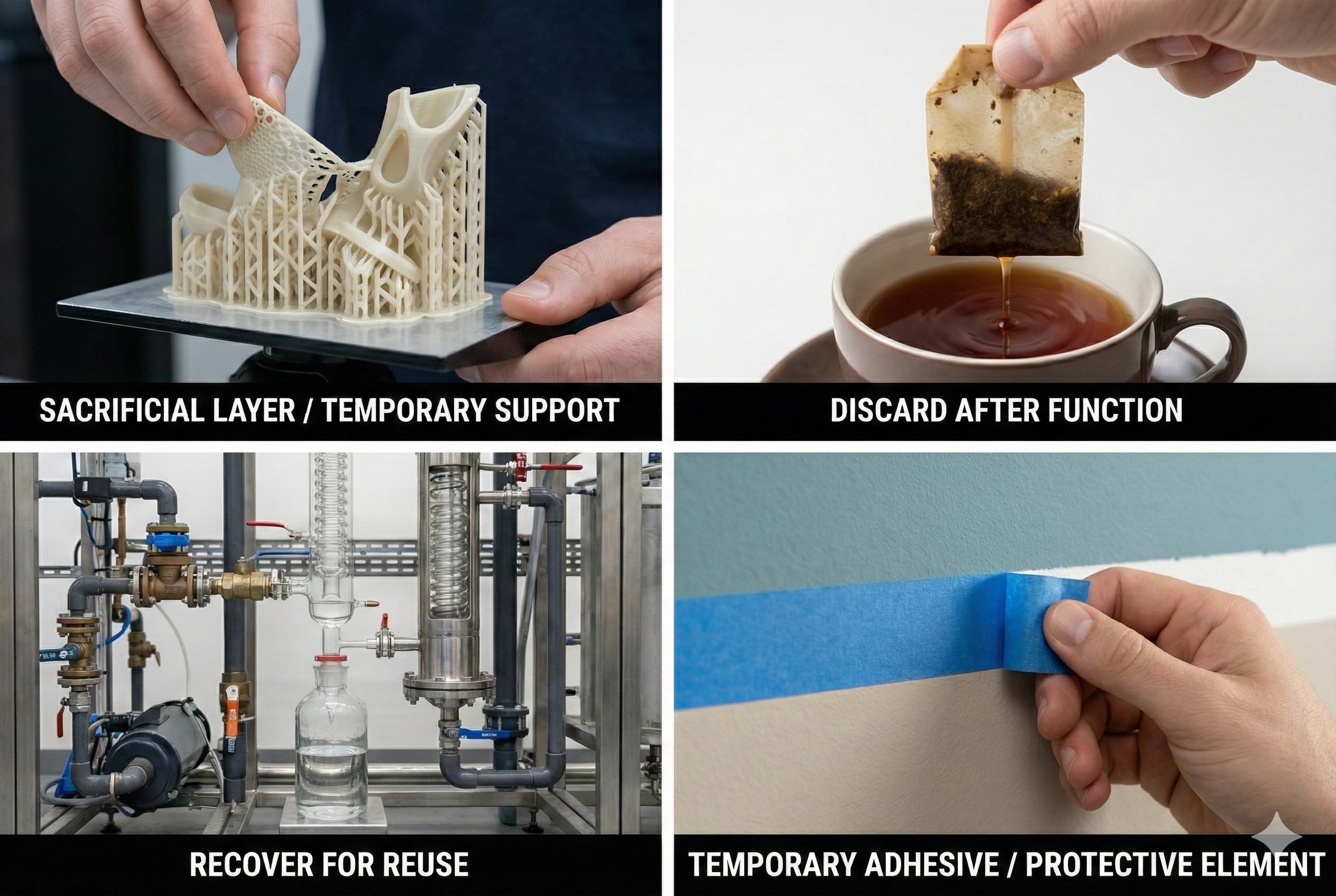 After a part has fulfilled its function, discard it (evaporate, dissolve, etc.) or abandon/remove it from the system to allow for the purpose intended to start;