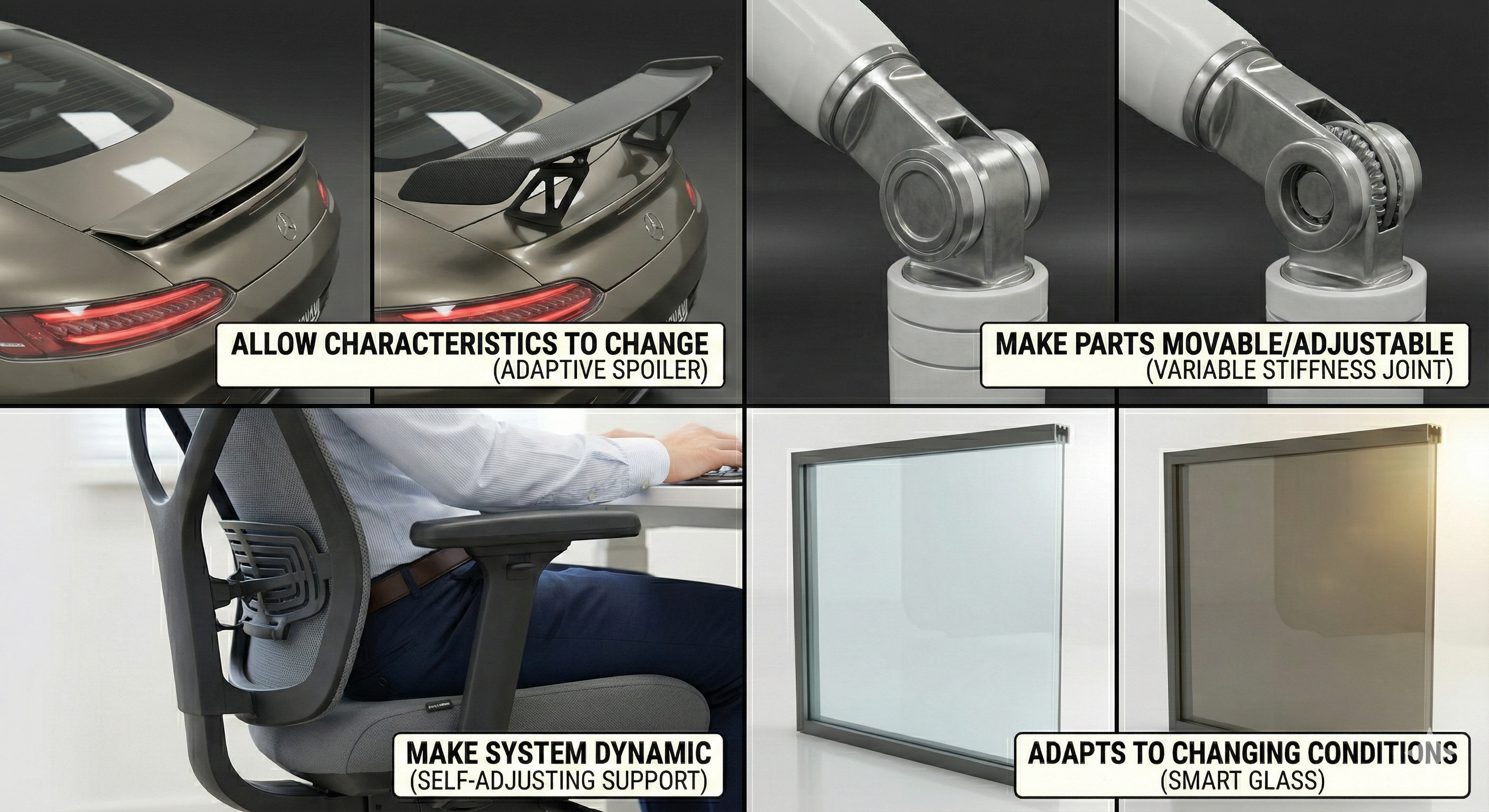 Dynamics is the practice of making a system or its parts adjustable, flexible, or adaptable so it can change its behavior or state for each operating condition—instead of having a rigid fixed geometry, design the system to optimally conform at various stages of its lifecycle, configuration, position, softness, shape or strength in multiple behavior states across changing loads, environments, and user needs.