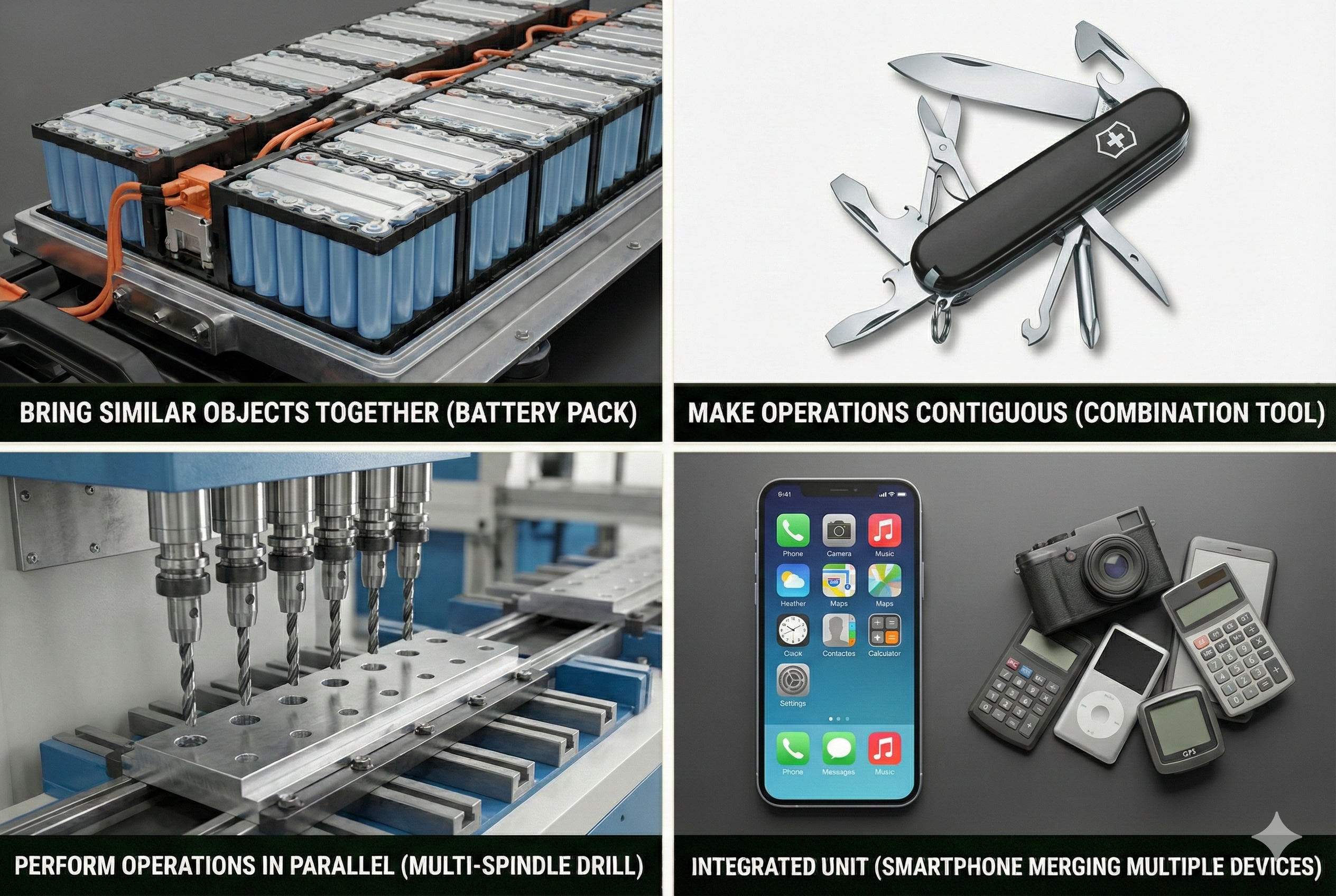 Bring identical or similar objects together (combine similar functions, system modules, group elements)