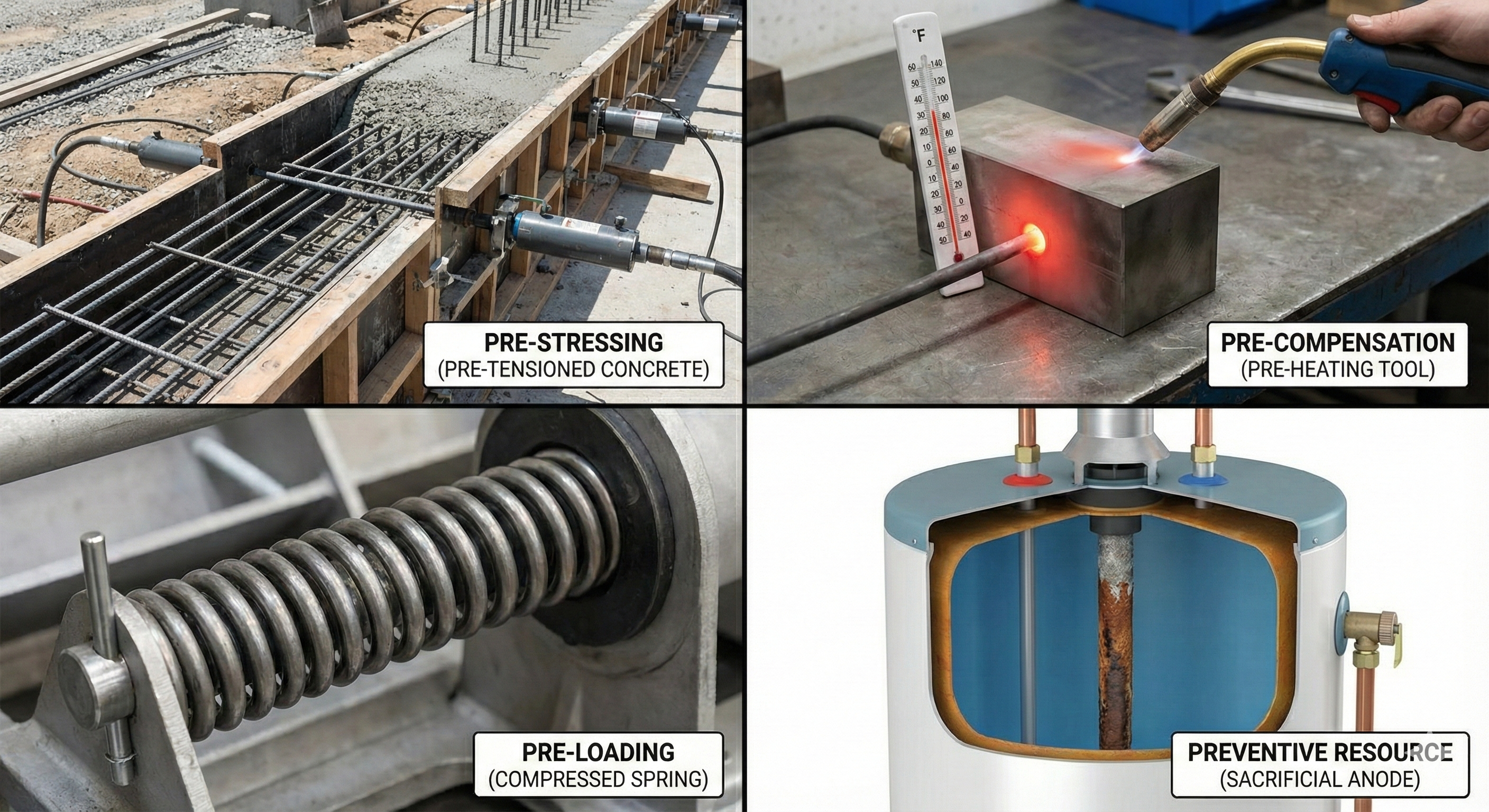Prior Counteraction is the practice of applying a known, controlled stress or force to an object or system before it is used, so that when the real work stress occurs, it is neutralized or balanced out—this prevents deformation, cracks, or total failure by 'fighting' the load before it even arrives.