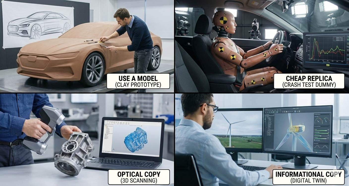 Copying is the practice of using a copy, model, or representation of an object or action instead of the original—especially when the original is expensive, fragile, dangerous, difficult to access, or hard to measure directly. Instead of interacting with the physical, you use replicas, simulations, templates, digital twins, or optical/sonic signals that provide the 'needed function' while reducing risk and cost.