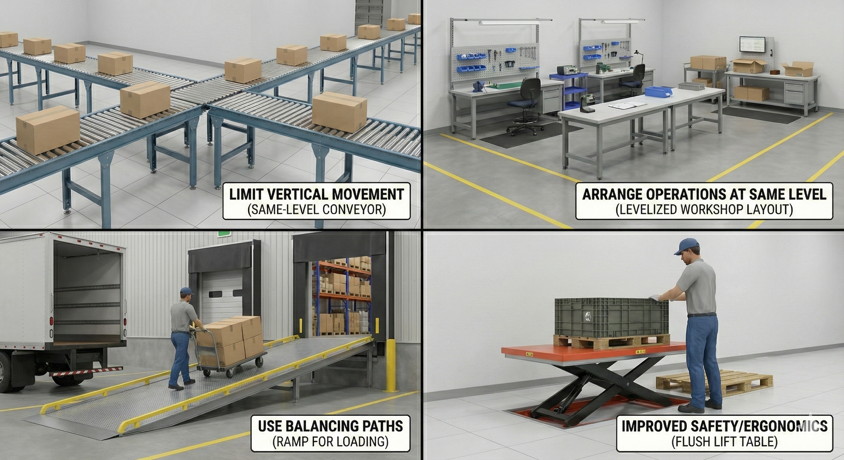 Equipotentiality is the practice of removing the need for lifting, lowering, or fighting potential energy (gravity) by adjusting the working environment or path so the object stays at the same relative level—it eliminates the energy-wasting effort of moving things against forces.