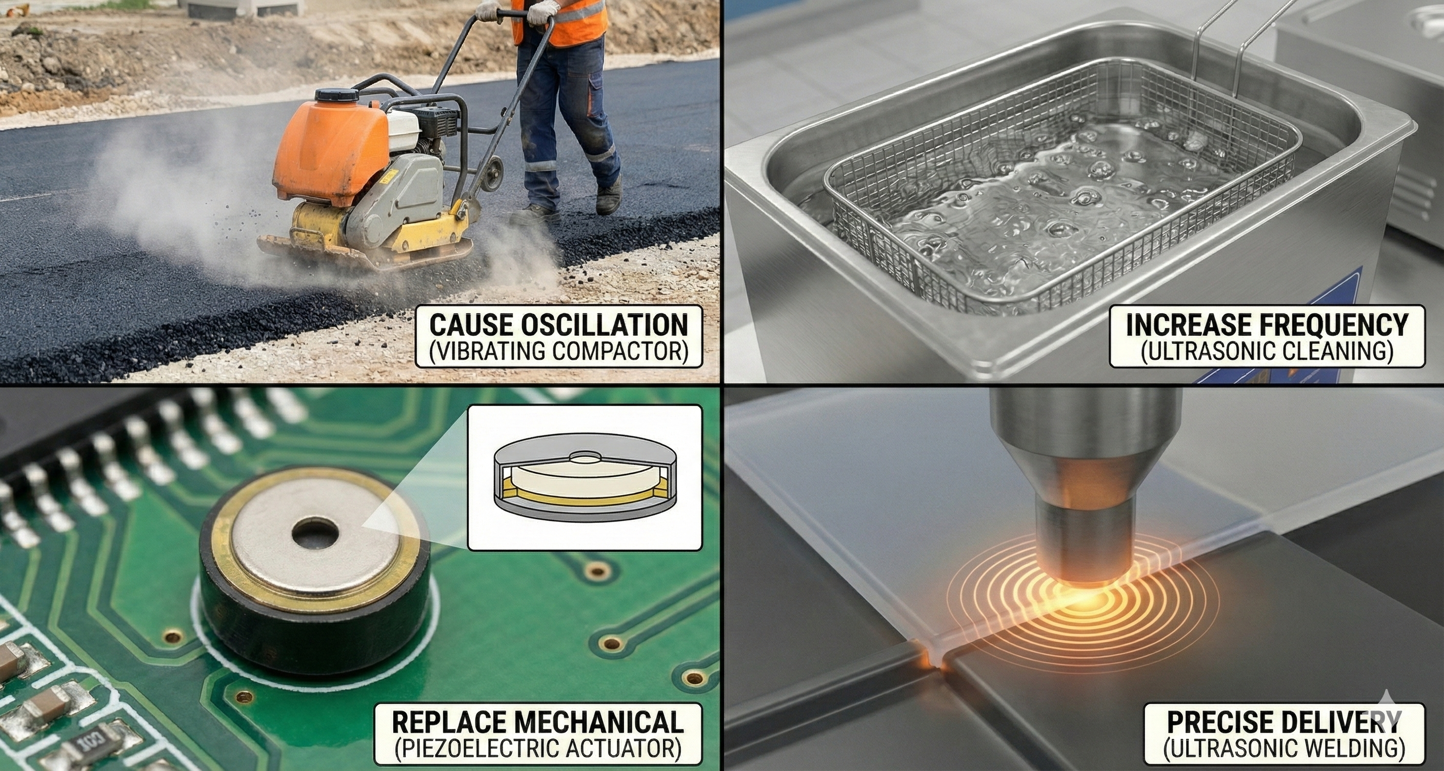 Mechanical Vibration is the practice of having an object oscillate or vibrate to remove friction, overcome resistance, or enable effects that are impossible with a steady, static action—instead of pushing harder, you introduce a small, fast back-and-forth (vibrating) movement to improve transport, impact, or separation/processing, or create resonance effects.